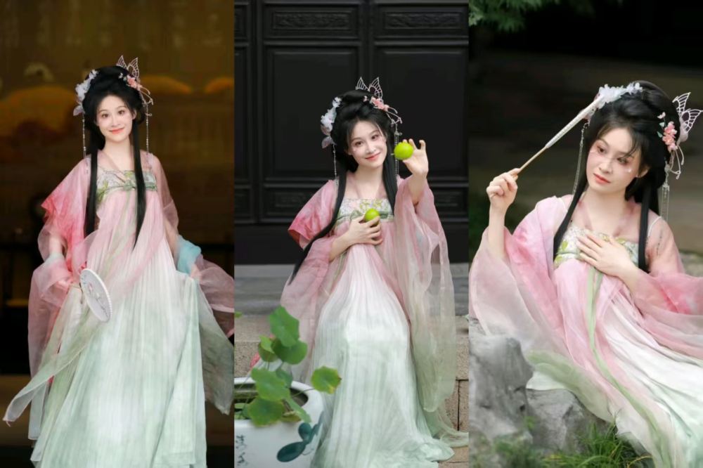 - Exquisite hair accessories. Holding a fan or fruit with graceful poise, set against ancient architecture and greenery, exuding gentle elegance.