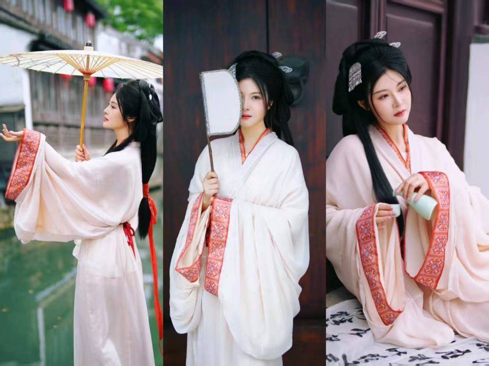 - A woman in a light beige Hanfu with red decorative trims. She holds an umbrella by the river, fans her face, or sits leisurely with a cup, each pose exuding classical elegance.