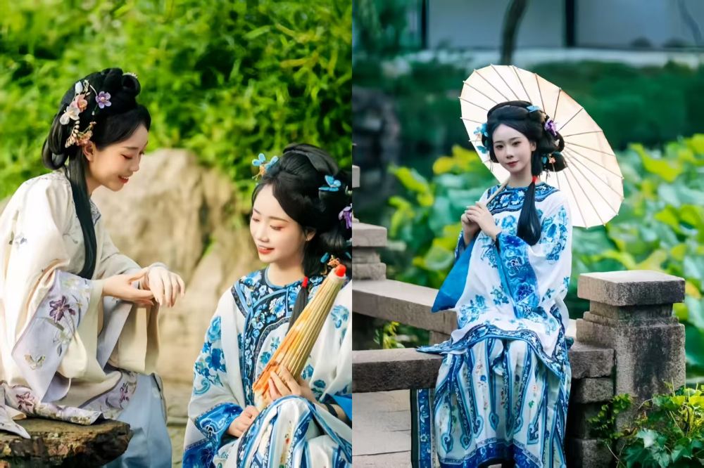 - Blue and white Hanfu adorned with blossoms exudes classical elegance, with verdant greenery enhancing the ancient charm.
