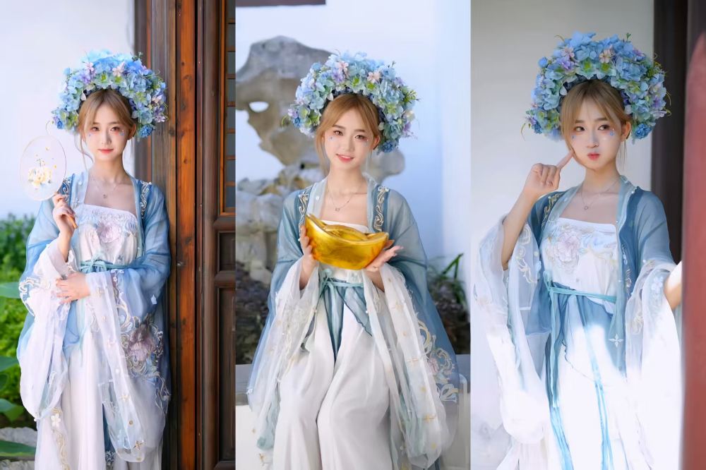 - Wearing blue floral hair accessories and a fresh blue-and-white Hanfu outfit, she playfully holds a round fan, showcasing a charming classical beauty beside ancient architecture.