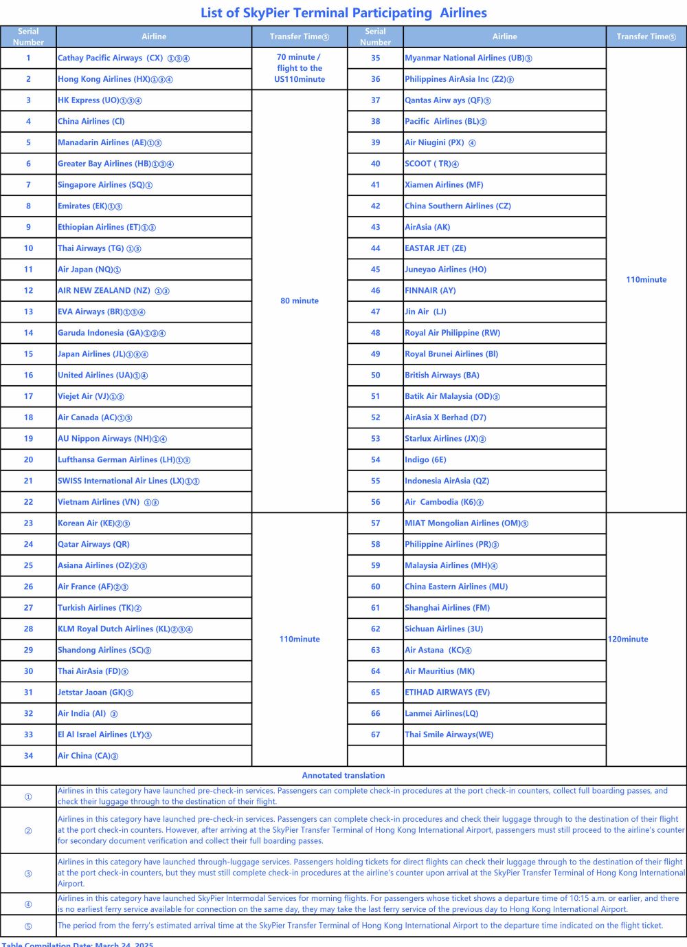 Passengers taking the ferry should arrive at Hong Kong International Airport and proceed to the Mainland China/Macau Fast Ferry Ticketing Counter at E2 Transfer Area (5th floor of Hong Kong International Airport) at least 60 minutes before departure. Present your e-ticket to exchange for a boat ticket and hand over your baggage tag to the counter staff to receive your ferry baggage ticket. The staff will assist with transferring your baggage to the ferry. After completing the boarding procedures, take the subway (Airport Express) to Hong Kong International Airport's SkyPier to board the ferry.