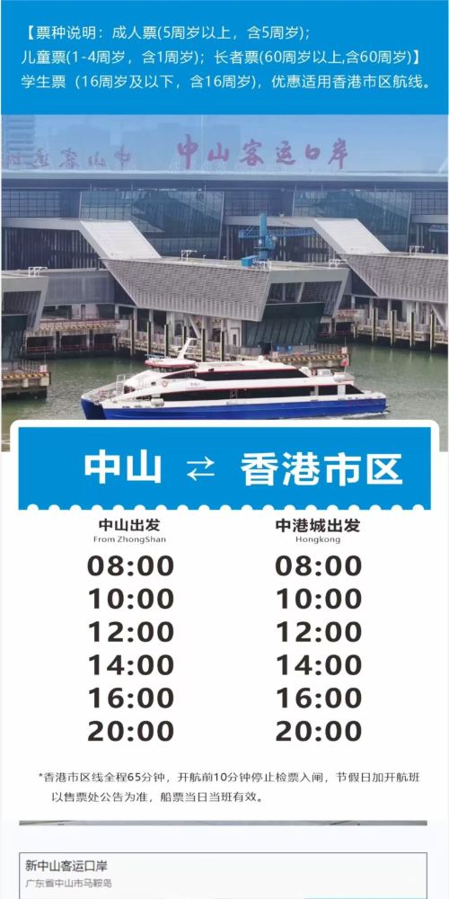 One-way/round-trip boat tickets from Zhongshan Port (New Zhongshan Passenger Port) to Hong Kong Tsim Sha Tsui Harbour City/China Ferry Terminal, direct high-speed ferry service